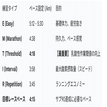 1. Tペース(4:18/km)の感覚: 現在の走力では、ハーフ目標ペース(4:15)はTペース(4:18)よりも速いです。これは生理学的に非常にキツい状態です。水曜の練習で4:15〜4:18/kmの感覚を「ややキツいけど維持できる」状態に持っていけるかが鍵です。