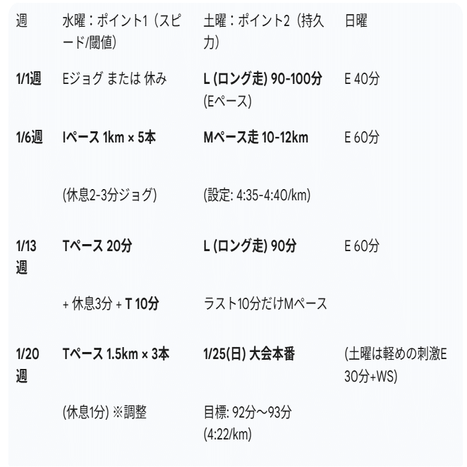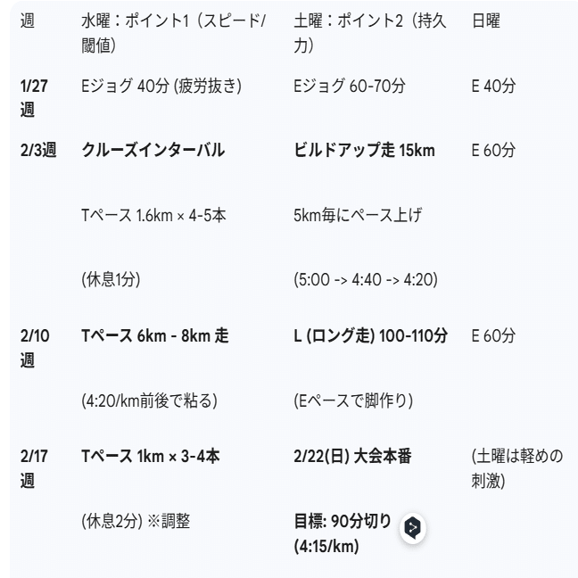 (※いまの走力:10km 41:59 → まずは「3/8で90分切り」を本命、1/25は調整レース2/22は実力チェックとして組みます)