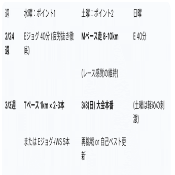 • しかも今回はハーフが1/25・2/22・3/8と3本あるので、距離より「質×回復」を優先したほうが伸びます。
