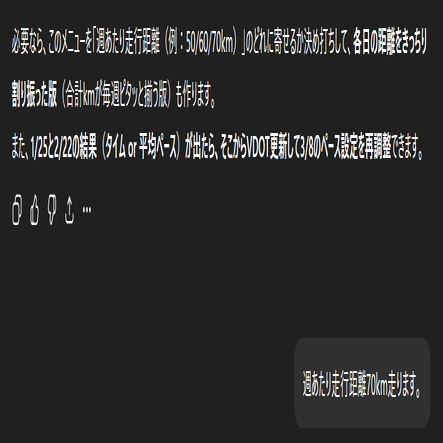 必要なら、上の「60→65→70」に合わせて、前に出した各週メニューの各日の距離を具体的に再配分した完成版(火何km・木何kmまで固定)を作って渡します。