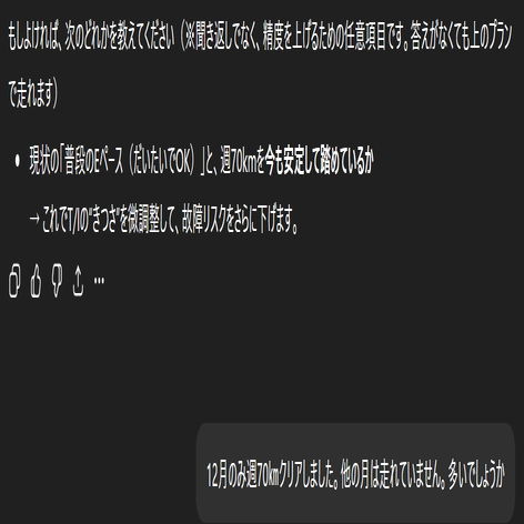 • 70kmを「継続できていた月が1か月だけ」だと、筋腱(アキレス腱・腸脛靭帯・足底など)が追いつかず、2〜4週後に故障 or 質が落ちるパターンが起きやすいです。